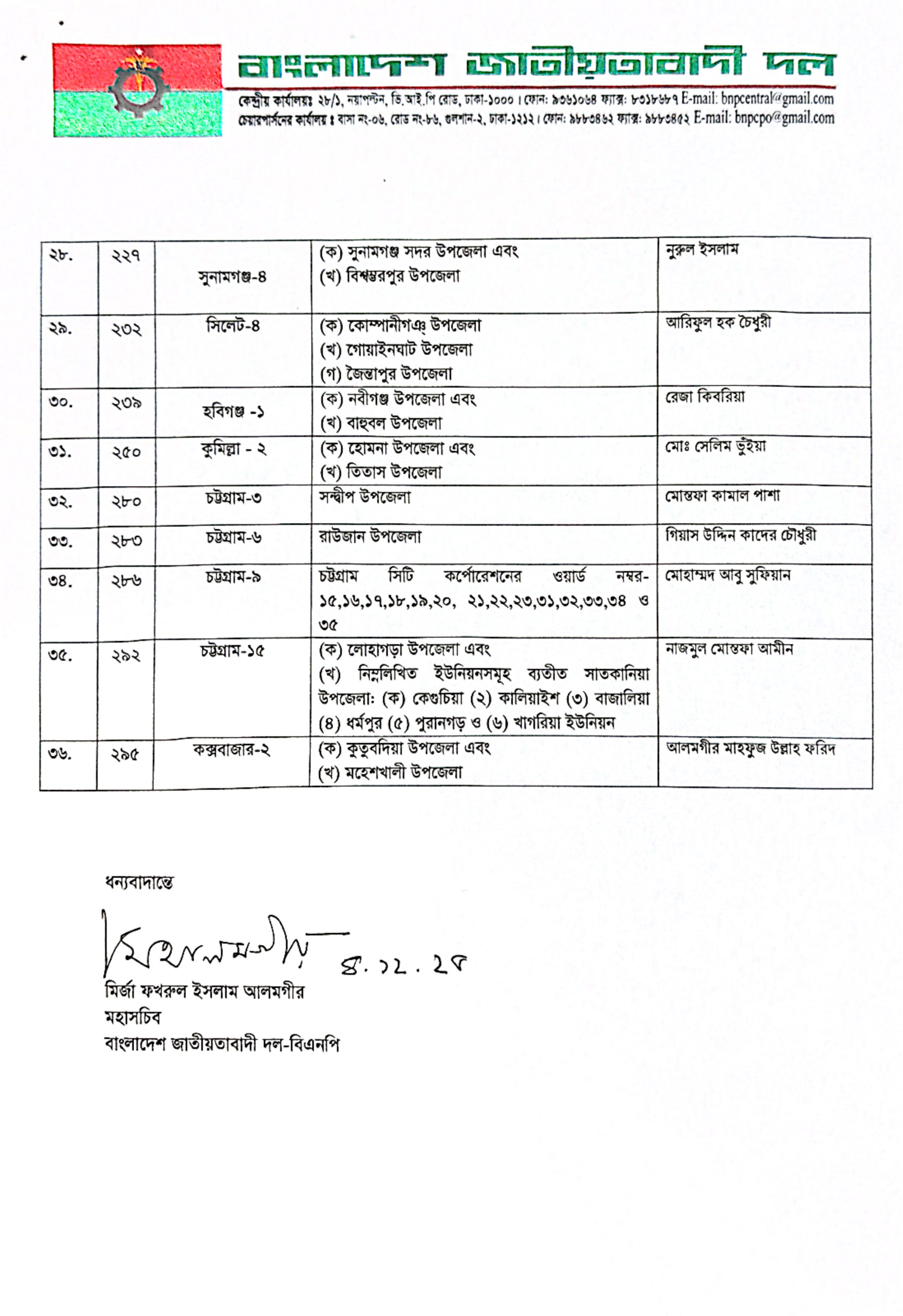 আরও ৩৬ আসনে বিএনপির প্রার্থী ঘোষণা