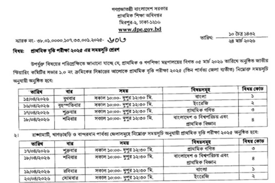 প্রাথমিক শিক্ষা অধিদপ্তর ২০২৫ সালের প্রাথমিক বৃত্তি পরীক্ষার সময়সূচি প্রকাশ করেছে। নির্দেশনায় বলা হয়েছে, দেশের অধিকাংশ জেলায় পরীক্ষা আগামী ১৫ এপ্রিল বুধবার থেকে শুরু হবে।