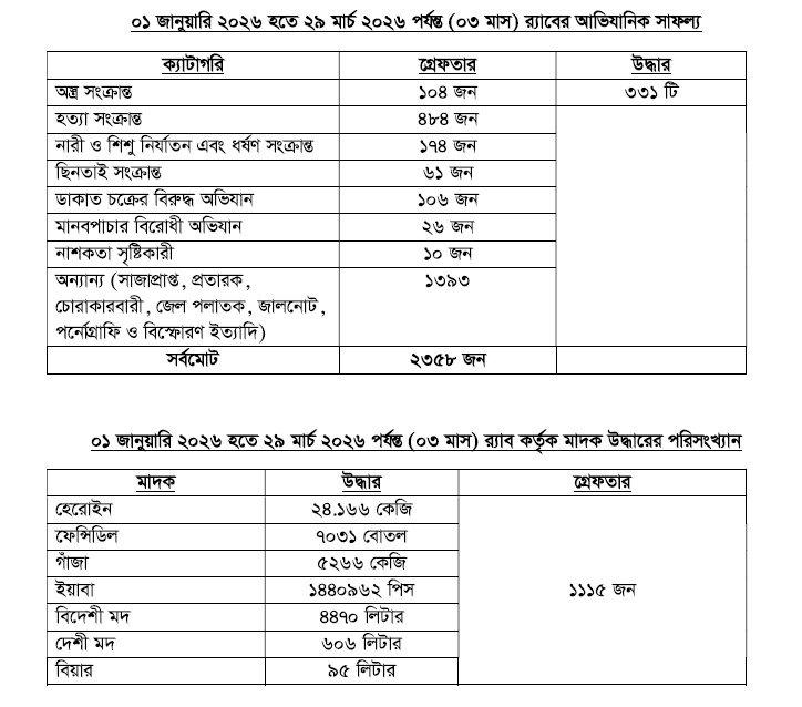 গত তিন মাসে দেশের বিভিন্ন স্থানে সংঘটিত ধর্ষণের ঘটনায় ১৭৫ জন, ছিনতাইকারী ৬১ জন, ডাকাত ১০৬ জন, মানবপাচারকারী ২৬ জনসহ ওয়ারেন্টভুক্ত আসামী এবং পর্নোগ্রাফি মামলায় ৩৪৭৩ জনকে গ্রেপ্তার করা হয়েছে। পাশাপাশি মাদকবিরোধী অভিযানে ১১১৫ জনকে আটক করা হয়েছে।