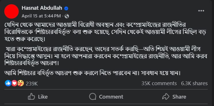 ফেসবুক পোস্টে লিখেন, যেদিন থেকে আমাদের আওয়ামী বিরোধী অবস্থান এবং কম্প্রোমাইজের রাজনীতির বিরোধিতাকে ‘শিষ্টাচারবহির্ভূত’ বলা শুরু হয়েছে, সেদিন থেকেই আওয়ামী লীগের মিছিল বড় হতে শুরু করেছে। যারা কম্প্রোমাইজের রাজনীতি করছেন, তাদের সতর্ক করছি—অতি শিঘ্রই আওয়ামী লীগ নিয়ে সিদ্ধান্তে আসুন। না হলে আপনারা করবেন কম্প্রোমাইজের রাজনীতি, আর আমি করব শিষ্টাচারবহির্ভূত আচরণ। আমি শিষ্টাচার বহির্ভূত আচরণ শুরু করলে নিতে পারবেন না। সাবধান হয়ে যান।