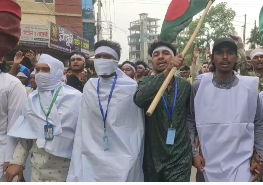 কেন্দ্র ঘোষিত কর্মসূচির অংশ হিসাবে কুড়িগ্রামে ছয় দফা দাবি আদায় ও কুমিল্লায় শিক্ষার্থীদের উপর হামলার প্রতিবাদে কাফনের কাপড় পড়ে মিছিলে নেমেছে কারিগরি প্রতিষ্ঠানের শিক্ষার্থীরা।