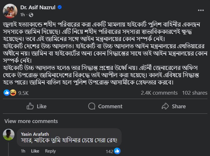 পোস্টে আসিফ নজরুল বলেন, জুলাই হত্যাকাণ্ডে শহীদ পরিবারের করা একটি মামলায় হাইকোর্ট পুলিশ বাহিনীর একজন সদস্যকে জামিন দিয়েছেন। এটি নিয়ে শহীদ পরিবারের সদস্যরা স্বাভাবিক কারণেই ক্ষুব্ধ হয়েছেন। তবে এই জামিনের সঙ্গে আইন মন্ত্রণালয়ের কোনো সম্পর্ক নেই।
