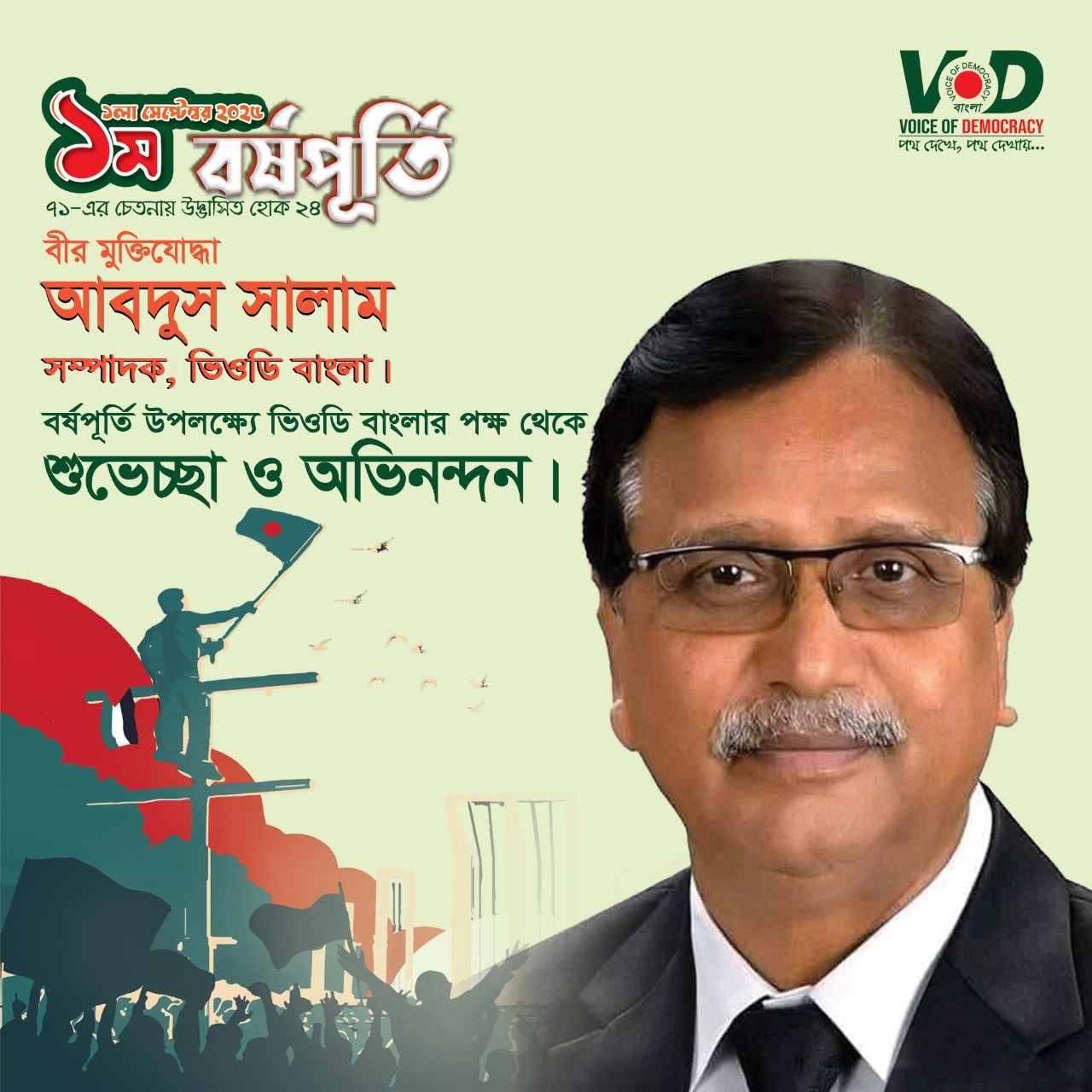 ‘পথ দেখে, পথ দেখায়’ স্লোগানকে সামনে রেখে সত্য ও বস্তুনিষ্ঠ সংবাদ প্রকাশে প্রথম বর্ষপূর্তিতে পা দিয়েছে জনপ্রিয় অনলাইন নিউজ পোর্টাল ‘ভিওডি বাংলা’ । গত বছরের ১ সেপ্টেম্বর এক ঝাক তরুণ সাংবাদিকদের সমন্বয়ে পথচলা শুরু করে ভিওডি বাংলা (VOD Bangla)। তাদের সেই পথচলার স্বপ্নকে বাস্তবায়নে কাজ করে যাচ্ছেন ভিওডি বাংলা’র সম্পাদক বীর মুক্তিযোদ্ধা মোহাম্মদ আবদুস সালাম। আজকের এই দিনে তার (সম্পাদক) প্রতি বিশেষ কৃতজ্ঞতা জানাচ্ছি। ভিওডি বাংলা পরিবার সম্পাদক মহোদয়ের শারীরিক সুস্থতা ও দীর্ঘায়ু কামনা করছি।
