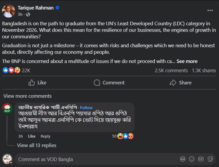 পোস্টে তারেক রহমান লিখেছেন, ২০২৬ সালের নভেম্বরে জাতিসংঘের স্বল্পোন্নত দেশ (এলডিসি) থেকে উত্তরণের পথে বাংলাদেশ। এটি কেবল একটি মাইলফলক নয়; এর সাথে কিছু ঝুঁকি এবং চ্যালেঞ্জও আছে, যা সরাসরি আমাদের অর্থনীতি এবং জনগণকে প্রভাবিত করতে পারে এবং এ সম্পর্কে আমাদের সৎ থাকতে হবে।