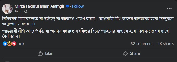 বিএনপির মহাসচিব মির্জা ফখরুল ইসলাম আলমগীর বলেন, নিউইয়র্ক বিমানবন্দরে যা ঘটেছে তা আবারও প্রমাণ করল আওয়ামী লীগ তাদের অন্যায়ের জন্য বিন্দুমাত্র অনুশোচনা করে না। আওয়ামী লীগ আজ পর্যন্ত যা অন্যায় করেছে সবকিছুর বিচার আইনের মাধ্যমে হবে। দল ও দেশের স্বার্থে ধৈর্য ধরুন।