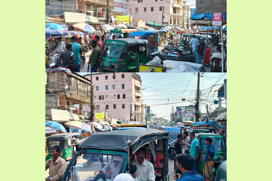 সরেজমিনে দেখা গেছে, পৌর শহরের জেলা পরিষদ মার্কেট থেকে আধুনিক হাসপাতাল পর্যন্ত রাস্তার দু’পাশে যত্রতত্র অটোরিকশা ও সিএনজির পার্কিং রয়েছে। ফুটপাত তো বটেই, রাস্তার একাংশ দখল করে বসানো হয়েছে চায়ের দোকান, ফল বিক্রেতা ও নানা পণ্যের অস্থায়ী দোকান।