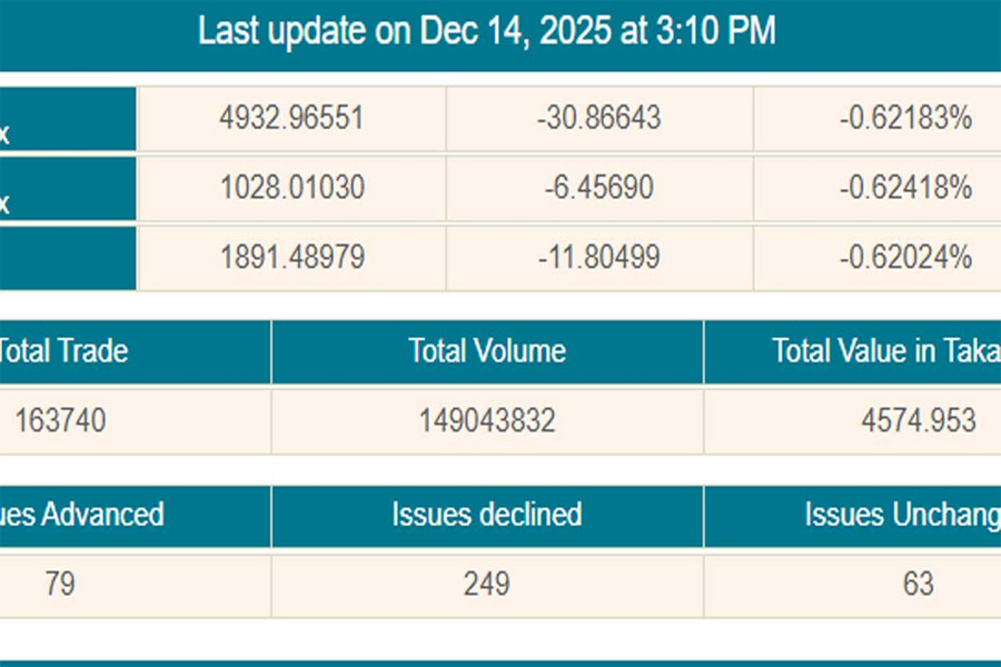 অধিকাংশ সিকিউরিটিজের দরপতন হওয়ায় আজ ডিএসইর প্রধান মূল্যসূচক ডিএসইএক্স ৩০ দশমিক ৮৬ পয়েন্ট কমে ৪ হাজার ৯৩২ পয়েন্টে নেমেছে। এছাড়া, ডিএসইর শরিয়াহ সূচক ডিএসইএস ৬ দশমিক ৪৫ পয়েন্ট কমে ১০২৮ পয়েন্ট এবং ডিএস-৩০ সূচক ১১ দশমিক ৮০ পয়েন্ট কমে ১৯০৩ পয়েন্টে দাঁড়িয়েছে।