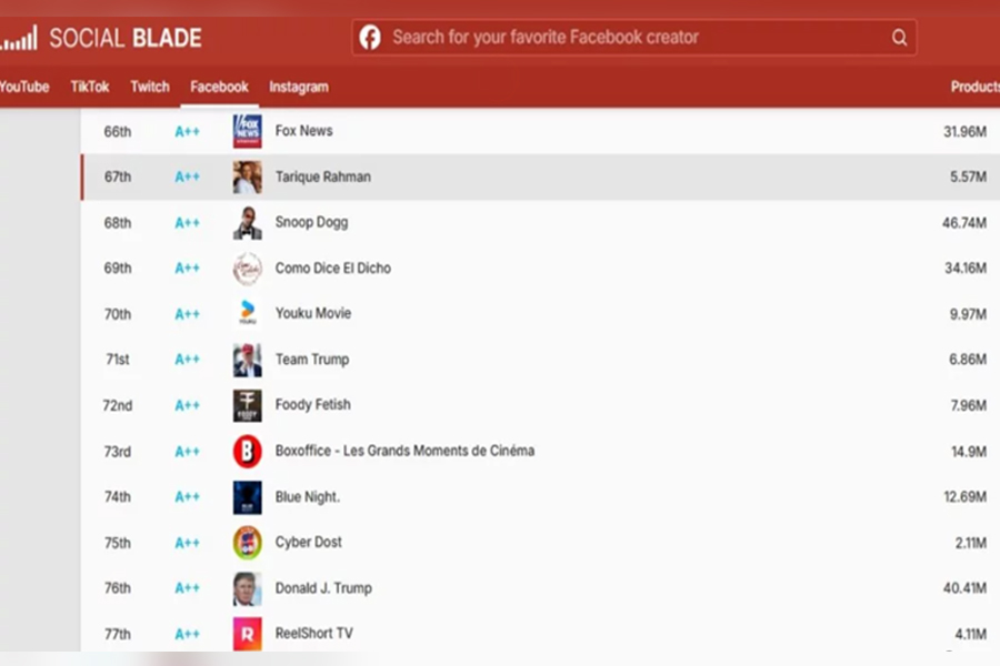 বিশ্বের সবচেয়ে প্রভাবশালী সামাজিক যোগাযোগমাধ্যমগুলোর মধ্যে একটি ফেসবুকে আলোচনার কেন্দ্রবিন্দু হয়ে উঠেছেন বিএনপি চেয়ারম্যান তারেক রহমান। আন্তর্জাতিক ওয়েবসাইট সোশ্যাল ব্লেডের প্রকাশিত শীর্ষ ১০০ ফেসবুক কনটেন্ট নির্মাতার তালিকায় তিনি ৬৭ নম্বরে জায়গা করেছেন।