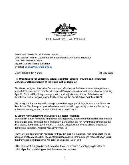 বাংলাদেশের অন্তর্বর্তীকালীন সরকারের প্রধান উপদেষ্টা অধ্যাপক ড. মুহাম্মদ ইউনূসের উদ্দেশ্যে কয়েকটি গুরুত্বপূর্ণ ইস্যুতে বুধবার (২১ মে) চিঠি দিয়েছেন অস্ট্রেলিয়ার পার্লামেন্টের ৪৩ জন সিনেটর ও এমপি। মোটাদাগে তিনটি ইস্যুকে সামনে আনা হয়েছে। সেগুলো হচ্ছে- জরুরি ভিত্তিতে সুনির্দিষ্ট নির্বাচনী রোডম্যাপ ঘোষণা, জুলাই অভ্যুত্থানের ভুক্তভোগীদের জন্য ন্যায়বিচার করা এবং র্যাপিড অ্যাকশন ব্যাটালিয়নের ভেঙে ফেলা।