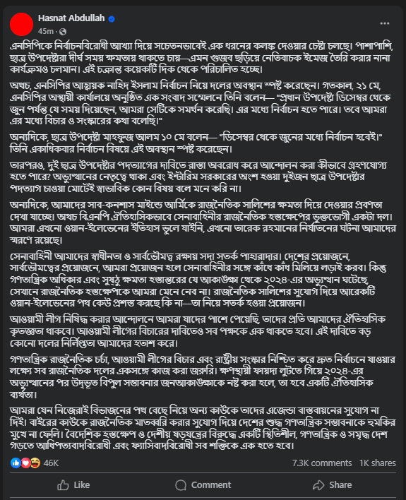 হাসনাত আব্দুল্লাহ বলেন, এনসিপিকে নির্বাচনবিরোধী আখ্যা দিয়ে সচেতনভাবেই এক ধরনের কলঙ্ক দেওয়ার চেষ্টা চলছে। পাশাপাশি, ছাত্র উপদেষ্টারা দীর্ঘ সময় ক্ষমতায় থাকতে চায়—এমন গুজব ছড়িয়ে নেতিবাচক ইমেজ তৈরি করার নানা কার্যক্রমও চলমান। এই চক্রান্ত কয়েকটি দিক থেকে পরিচালিত হচ্ছে। অথচ, এনসিপির আহ্বায়ক নাহিদ ইসলাম নির্বাচন নিয়ে দলের অবস্থান স্পষ্ট করেছেন। গতকাল, ২১ মে, এনসিপির অস্থায়ী কার্যালয়ে অনুষ্ঠিত এক সংবাদ সম্মেলনে তিনি বলেন— "প্রধান উপদেষ্টা ডিসেম্বর থেকে জুন পর্যন্ত যে সময় দিয়েছেন, আমরা সেটিকে সমর্থন করেছি। এর মধ্যে নির্বাচন হতে পারে। তবে আমরা এর মধ্যে বিচার ও সংস্কারের কথা বলেছি।"